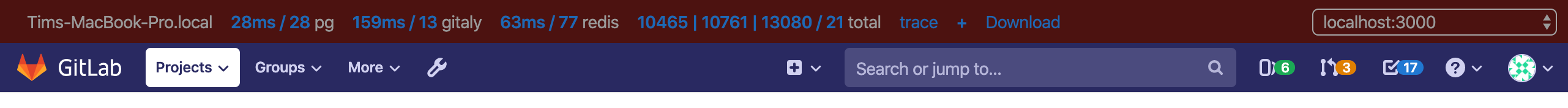 You can display the GitLab Performance Bar to see statistics for the performance of a page. When activated, it looks as follows: