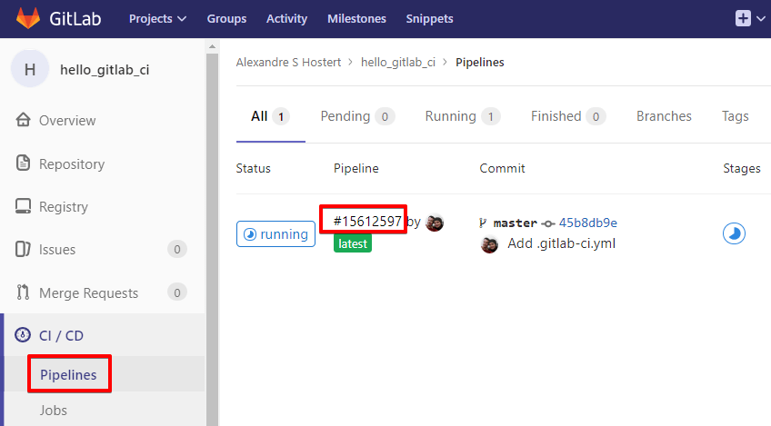 Let’s go to Pipelines and see GitLab doing the job. Just click on Pipelines to find the actual running build job.