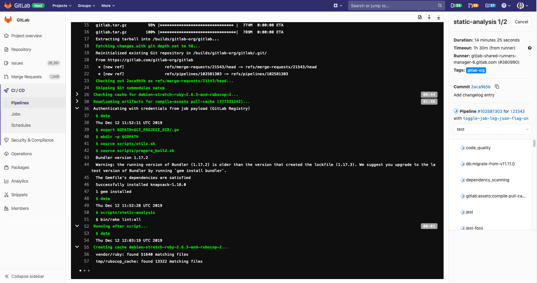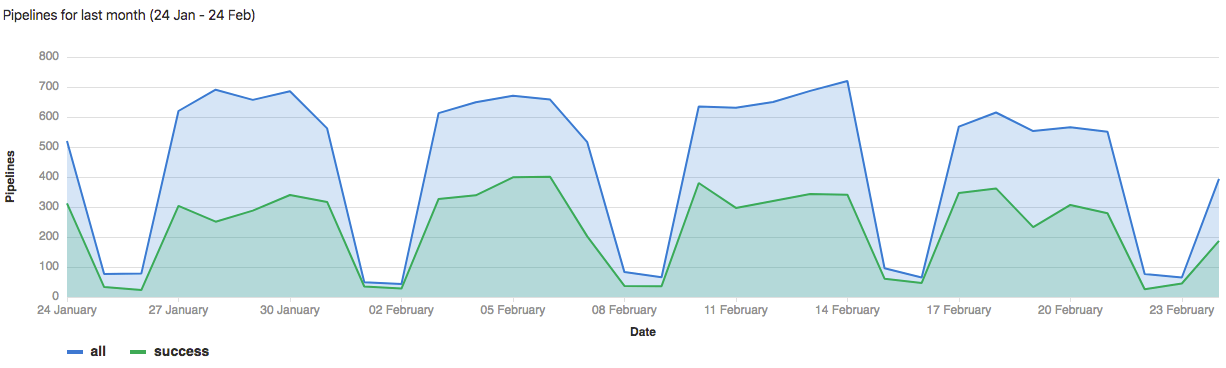 GitLab tracks the history of your pipeline successes and failures, as well as how long each pipeline ran. To view this information, go to Analytics > CI / CD Analytics.