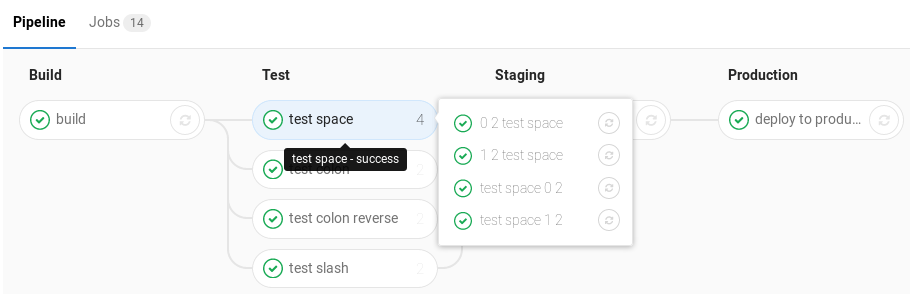 Regular pipeline graphs show the names of the jobs in each stage. Regular pipeline graphs can be found when you are on a single pipeline page. For example: