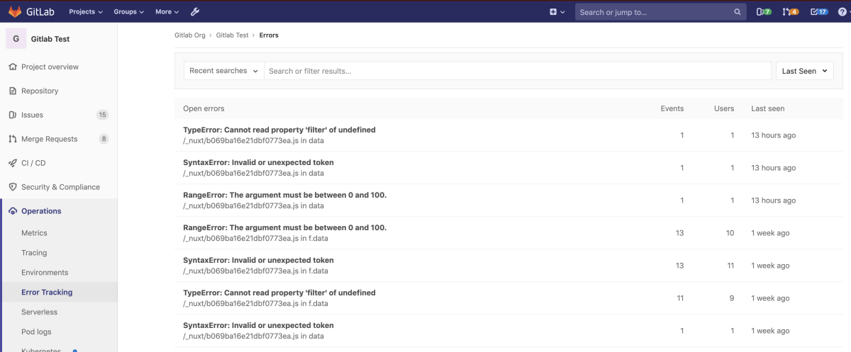 You can find the Error Tracking list at Operations > Error Tracking in your project’s sidebar. Here, you can filter errors by title or by status (one of Ignored , Resolved, or Unresolved) and sort in descending order by Frequency, First Seen, or Last Seen. By default, the error list is ordered by Last Seen and filtered to Unresolved errors.