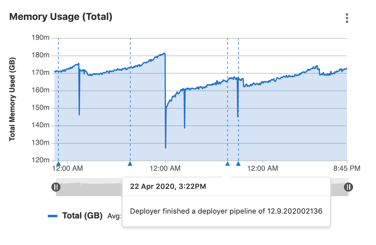 You can use Metrics Dashboard Annotations to mark any important events on every metrics dashboard by adding annotations to it. While viewing a dashboard, annotation entries assigned to the selected time range will be automatically fetched and displayed on every chart within that dashboard. On mouse hover, each annotation presents additional details, including the exact time of an event and its description.