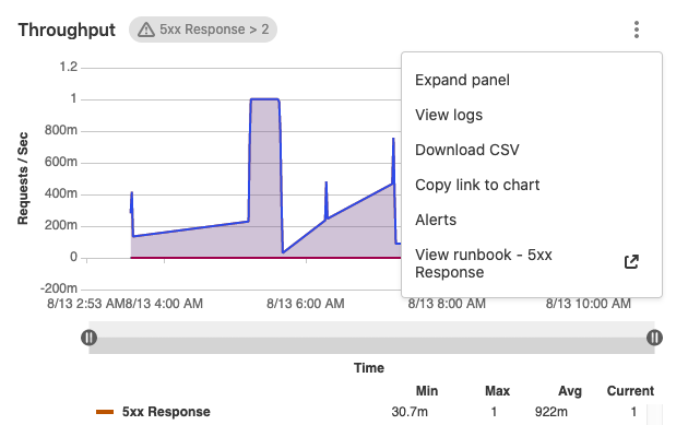 - View logs - Displays Logs, if they are enabled. If used in conjunction with the timeline zoom feature, logs narrow down to the selected time range. (Introduced in GitLab 12.8.)