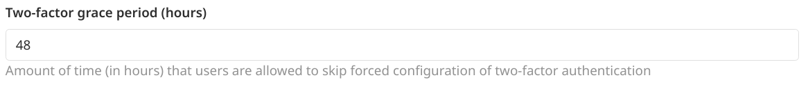 Once the two-factor authentication is configured as mandatory, the users will be allowed to skip forced configuration of two-factor authentication for the configurable grace period in hours.