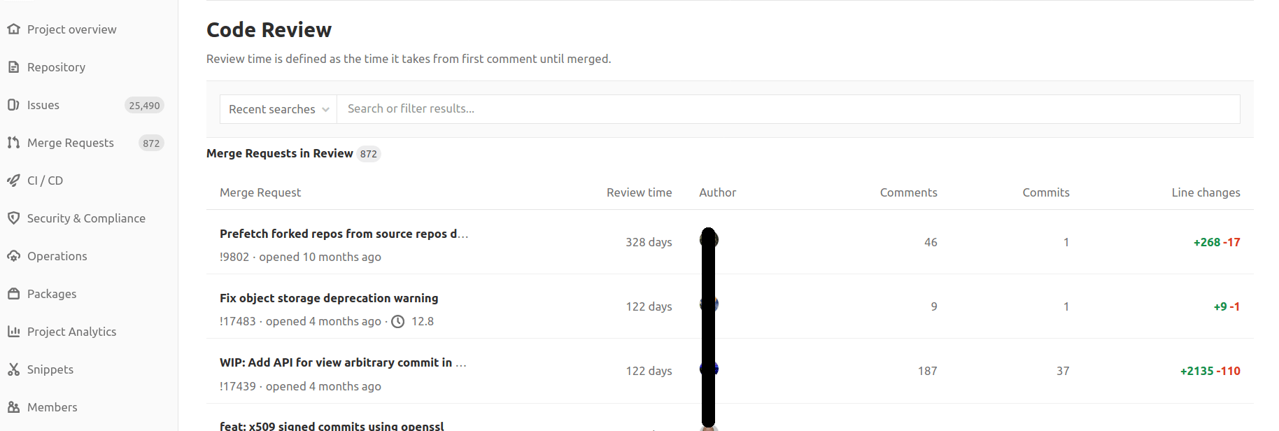 Code Review Analytics makes it easy to view the longest-running reviews among open merge requests and enables you to: