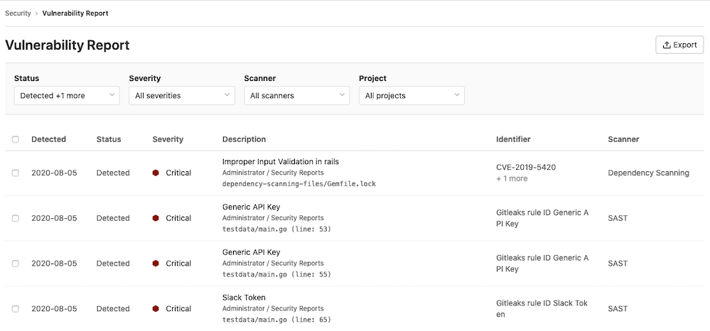 - Vulnerability reports: Detailed lists of all vulnerabilities for the instance, group, project, or pipeline. This is where you triage and manage vulnerabilities.