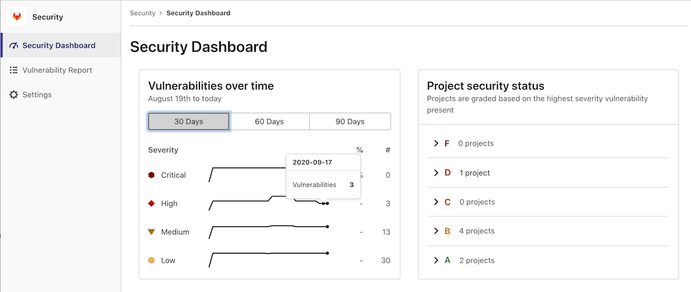 - Security dashboards: An overview of the security status in your instance, groups, and projects.