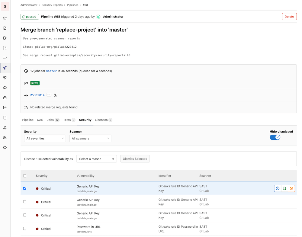 At the pipeline level, the Security section displays the vulnerabilities present in the branch of the project the pipeline was run against.