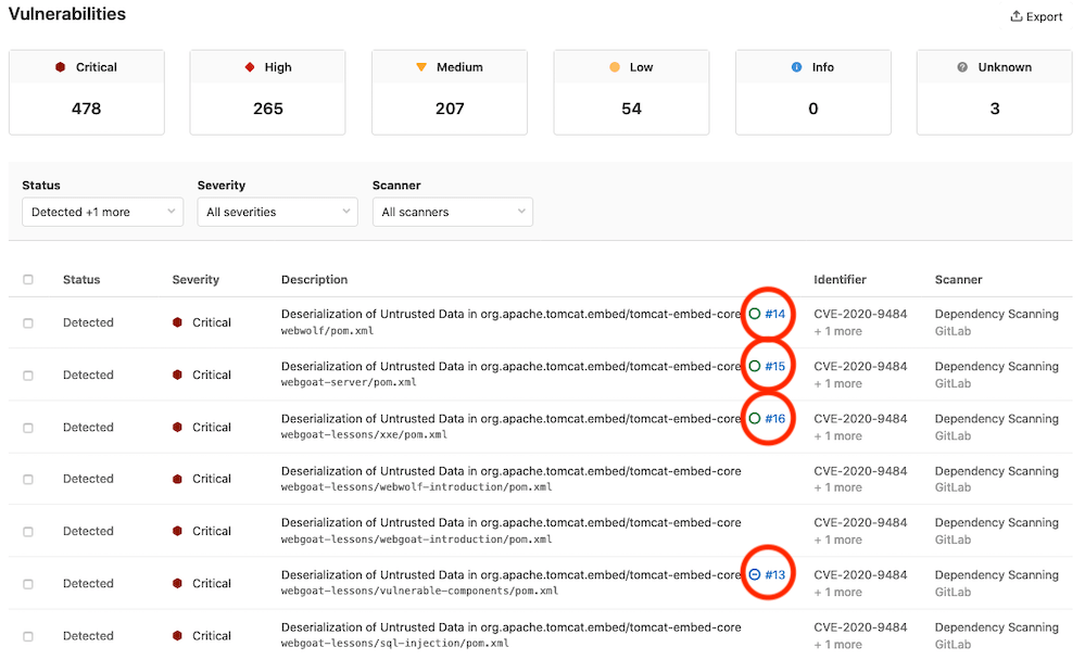 Each vulnerability report contains vulnerabilities from the latest scans that were merged into the default branch.