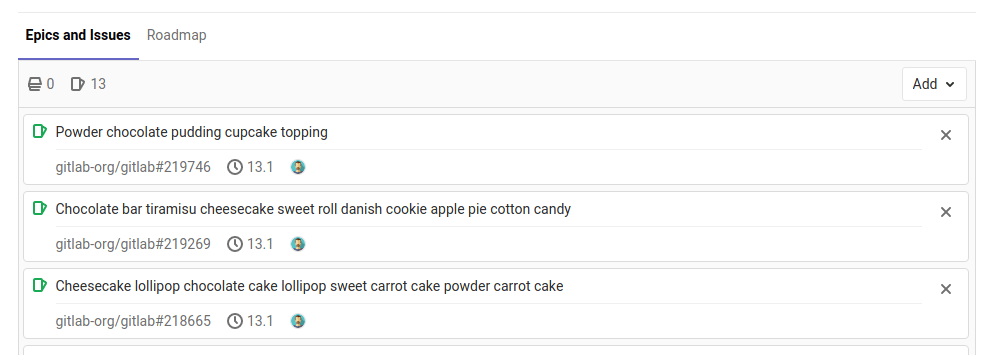 - Search for the desired issue by entering part of the epic’s title, then selecting the desired match (introduced in GitLab 12.5).