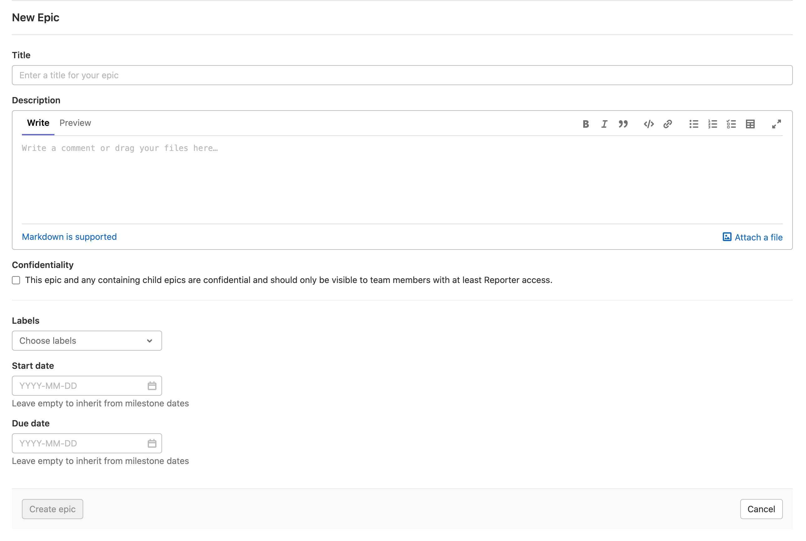 When you’re creating a new epic, these are the fields you can fill in:
