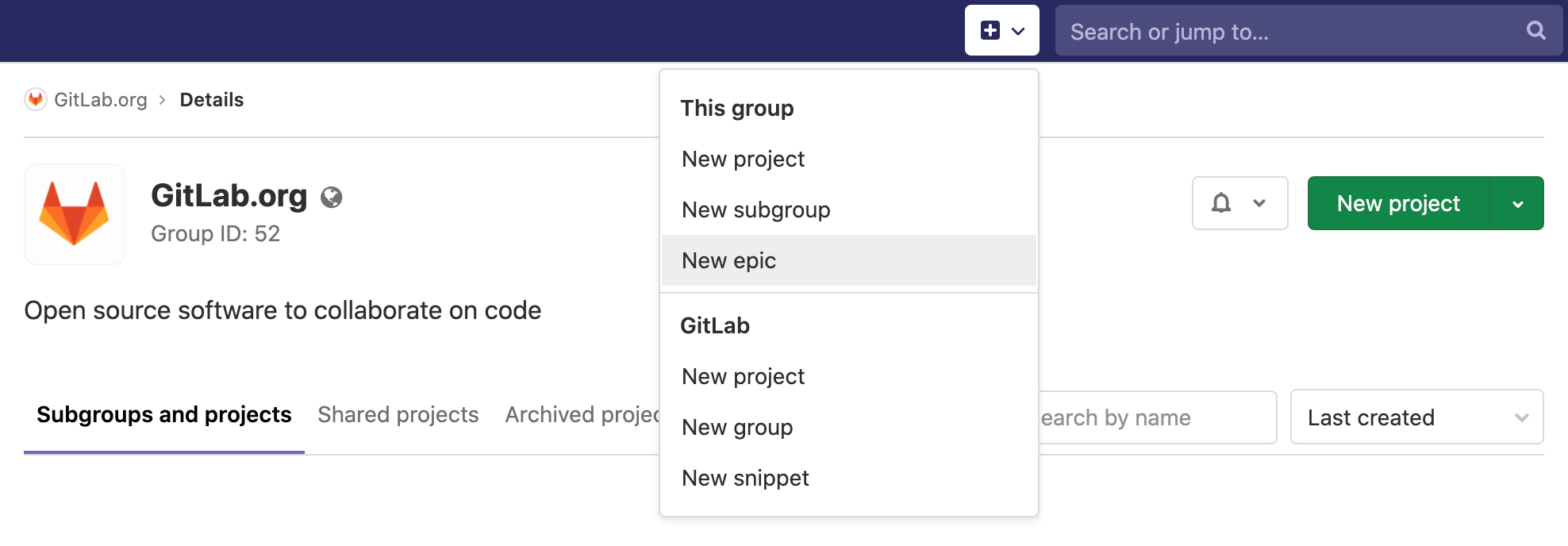 A paginated list of epics is available in each group from where you can create a new epic. The list of epics includes also epics from all subgroups of the selected group. From your group page: