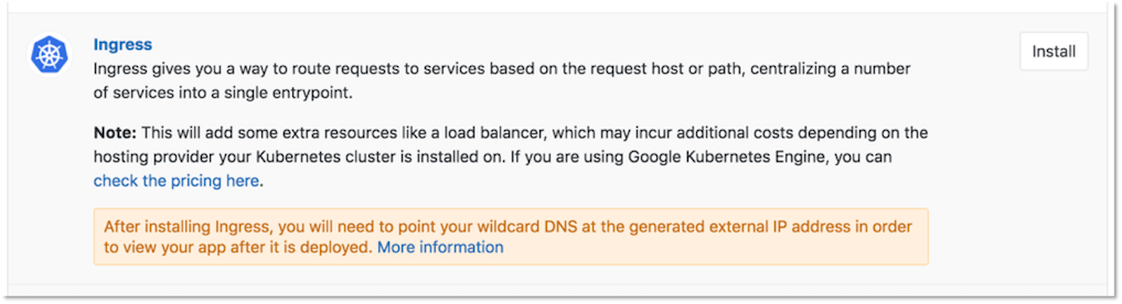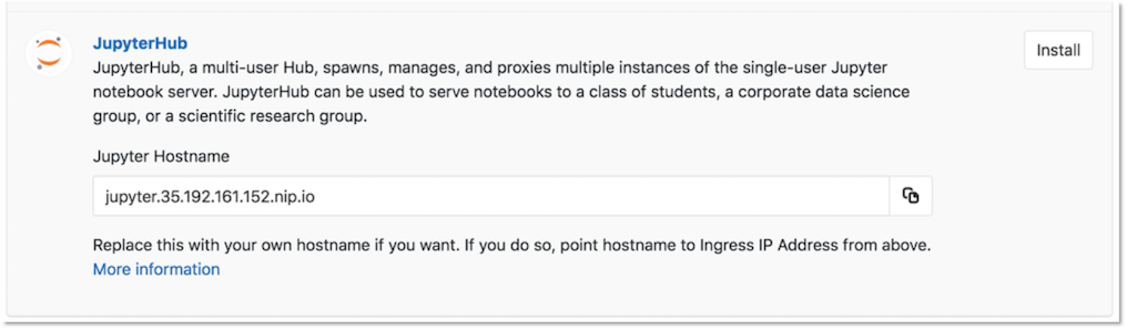 After Ingress has been installed successfully, click the Install button next to the JupyterHub application. You will need the Jupyter Hostname provided here in the next step.