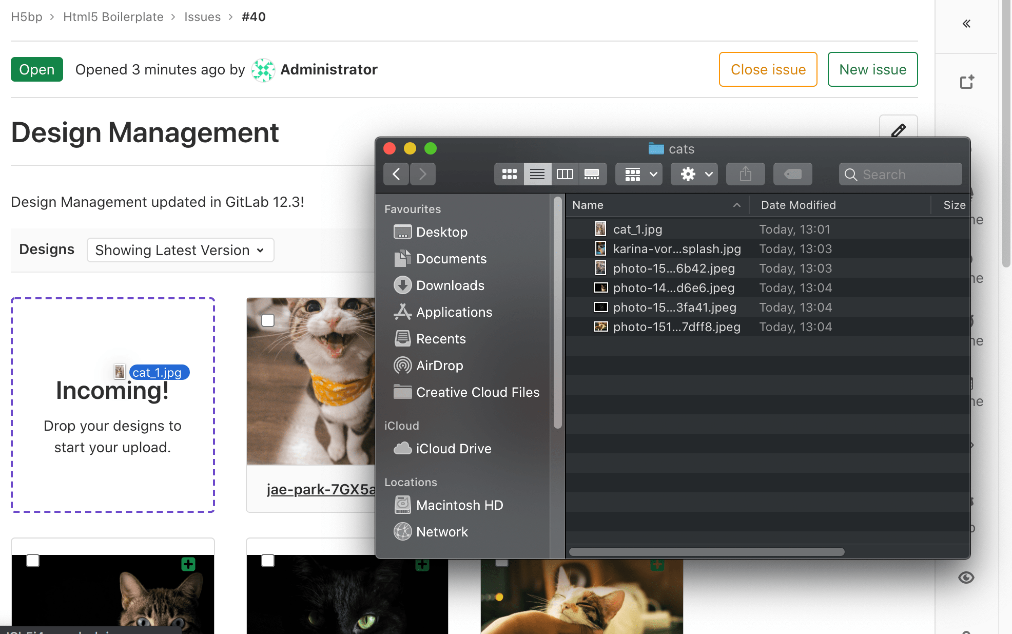 Introduced in GitLab 12.10, you can also copy images from your file system and paste them directly on GitLab’s Design page as a new design.