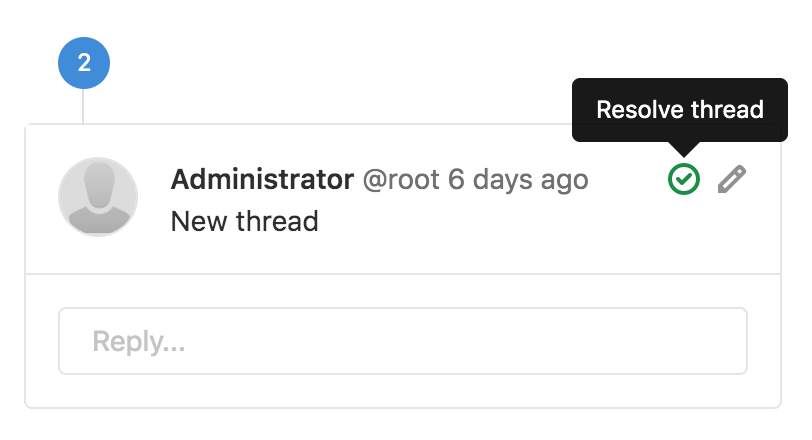 - You can mark a thread as resolved or unresolved by clicking the checkmark icon for Resolve thread in the top-right corner of the first comment of the discussion: