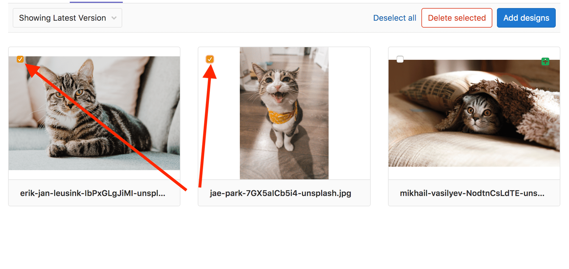 To delete multiple designs at once, on the design’s list view, first select the designs you want to delete: