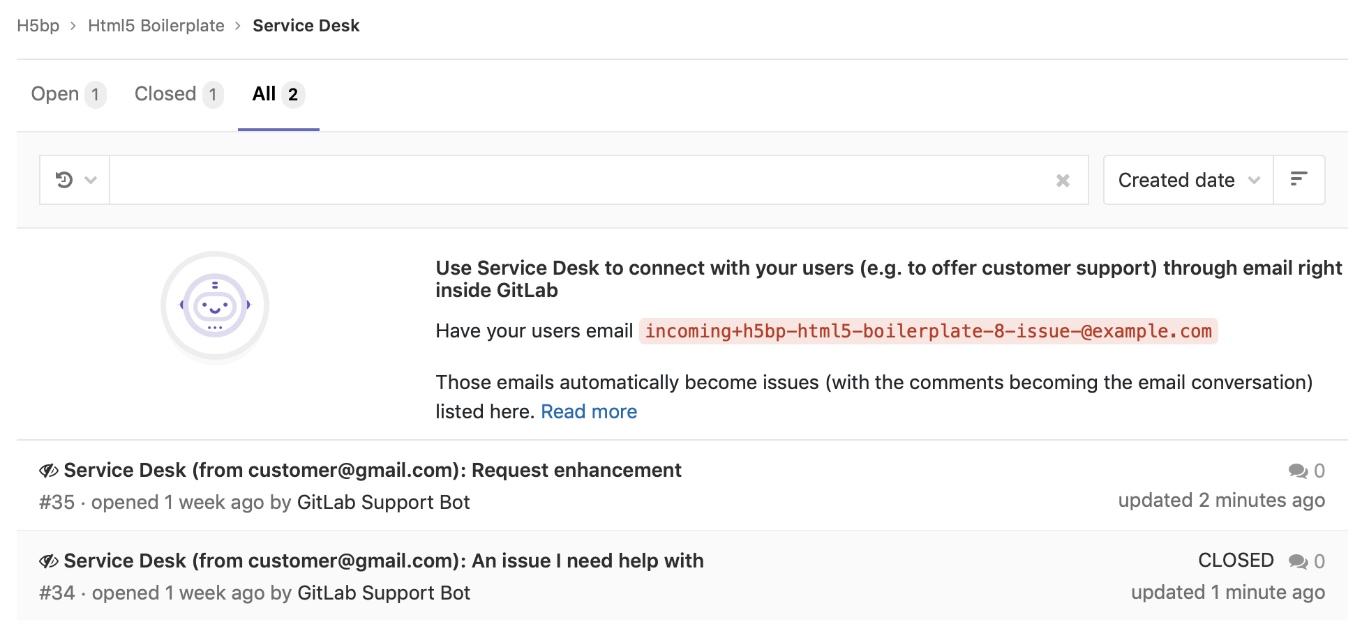 As a result, a new Service Desk issue is created from this email in the mygroup/myproject project.